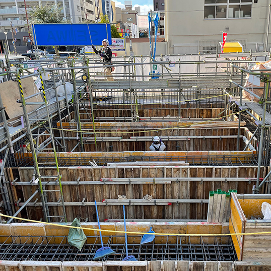 各種建築物のほか、橋梁や堰堤、砂防といった公共施設などの構造物をつくるため、まずはコンクリートを流し込むための型枠を組み立てることが必要で、そのための作業が「型枠工事」です。施設の強度や耐用年数を左右する、まさに建築の要といえる工事ですので、その施工にあたっては綿密に作成された図面を読みとる力と、狂いのない慎重な作業が求められます。型枠自体の正確な組み立てに加えて、生の状態のコンクリートを成形するために加える圧力のコントロールにも職人の技術が必要とされます。